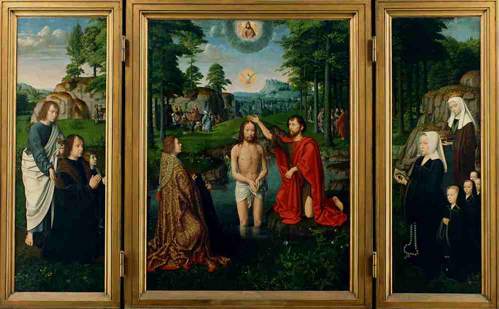 Baptism of Christ, altarpiece, triptych, oil on wood, Gerard David, ca 1507, Groeningemuseum, Bruges, Belgium.
