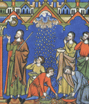 Manna, illuminated manuscript, 1244 to 1254, The Crusader Bible, MS M.638 (fol. 9v), Pierpont Morgan Library of Medieval and Renaissance Manuscripts, New York.