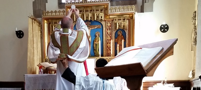 Mass in the Basilica of Our Lady of Walsingham (The Slipper Chapel), with Fr Michael Collis and altar server, Joshua Clovis.
