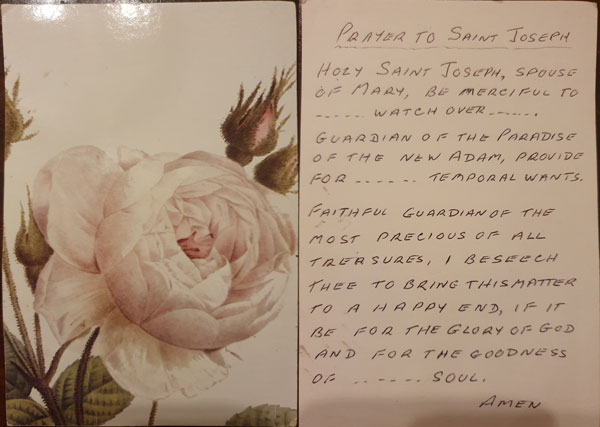 Pat was (and is still!) a very holy, gentle woman. She had a great love for the Sacred Heart of Jesus and was one of the ladies of the parish you could rely on to be at daily devotions, rain, hail or shine. She was also one of those self-effacing people who always had a kind word, and was willing to give the benefit of the doubt to you, if there was some doubt about your wholesomeness! I still remember the time when there was a bit of a kerfuffle going on, and she said to me, “I don’t think those things they said about you were true.” (I still haven’t found out what she meant, but never mind.) So I felt quite attached to Pat, and since her funeral, I had been thinking about a prayer card she once gave to me when I was desperately upset, and wondered where on earth I had put it. Well, within a week of her funeral, lo and behold, I was doing some tidying up and came upon C.S. Lewis’s Mere Christianity in a pile of paperwork, whereupon this prayer card of hers fell out, as I had been using it as a bookmark. That gave me another of those satisfying shivers (thanks, Pat!)