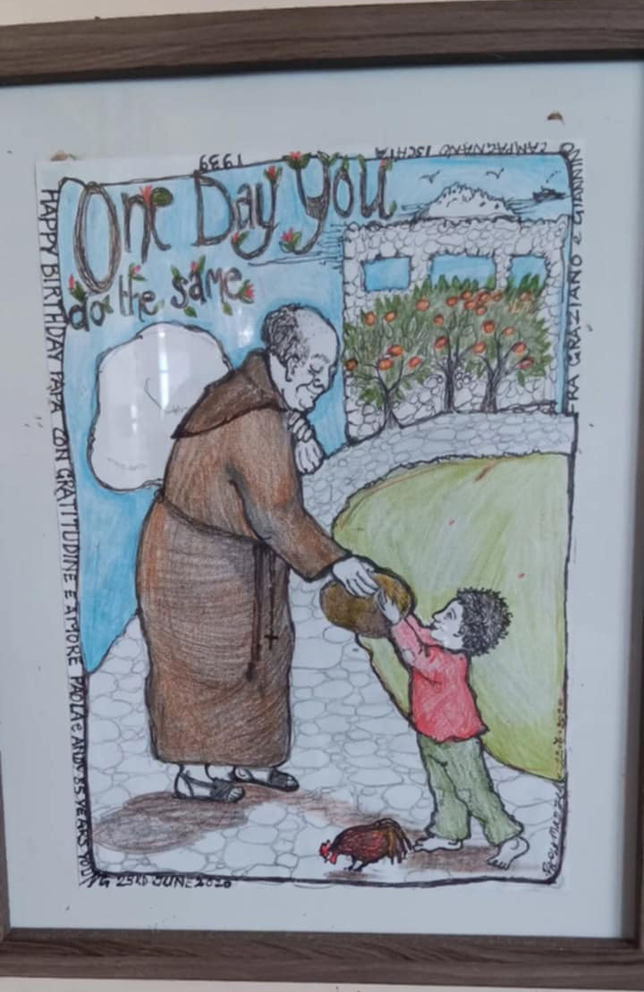 He always remembered the hungry days of his childhood when food was scarce and bread was a source of life. In those days the Franciscan begging monk Fra Graziano would carry a sack of bread up the hill to his village – he remembered as a 4 year old hugging him in thanks, and the monk affectionately replying “Don’t thank me little one -when you’re big -you do the same ” ..