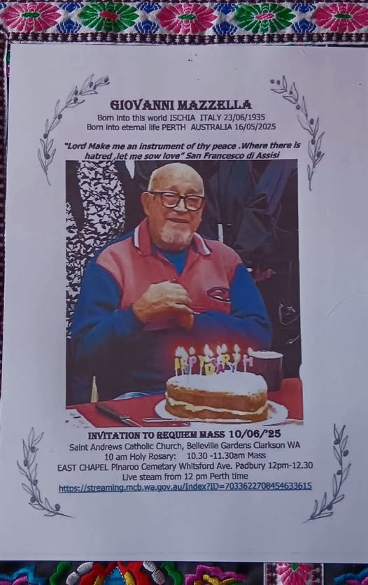 On 16 May 2025, we lost one of our most beloved and long-standing parishioners, Giovanni (Gianni) Mazzella, husband of Anne Mazzella who passed away in 2018.