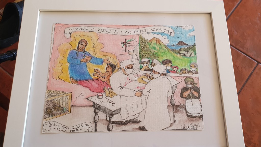 One hot summer young Giannino got a hernia and fell into a life-threatening high fever. His mother, unable to pay for a hospital operation, sent for a cousin with medical knowledge and a nurse friend who had some local anaesthetic. Watched on by curious neighbours and relatives, he was tied to the kitchen table and operated on. Left with strict instructions not to let him drink until he had peed, thirsty young Giannino repeatedly begged for water. The only thing his mother could suggest was for everyone to pray the Rosary to Our Lady. During the hot night he kept asking for water until finally his mother appeared dressed in a blue robe and gave him enough to drink till his thirst was quenched and he was able to relax and fall into a deep sleep. Next morning when he awoke, his whole family was anxiously watching him. ”Aren’t you thirsty?” “ No Mamma!- last night you handed me a jug of water and I drank so much -I’m not thirsty at all “ ”It wasn’t me!” said his Mum. “ Yes,” said Giannino –“You were dressed all in blue”.